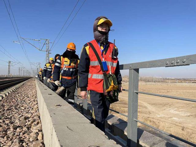 穿著工服、系著安全帶的闞旭東,行走在黃河上方20多米高的包西鐵路黃河特大橋上。他的身旁一側(cè)是凍結(jié)的黃河冰面,一側(cè)是鐵路軌道。凜冽的寒風(fēng)呼呼地刮著,在零下十幾攝氏度的冬日,不一會(huì)兒,闞旭東的耳朵、臉頰就被吹得通紅,鼻涕也不爭(zhēng)氣地流下來(lái)。