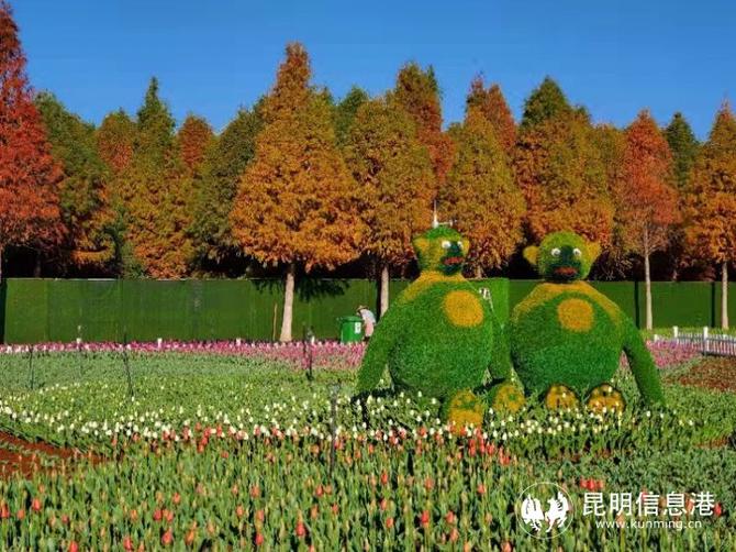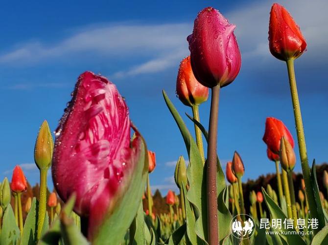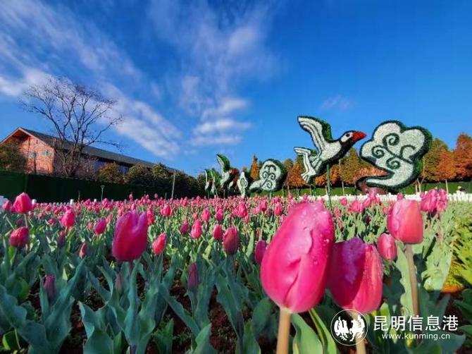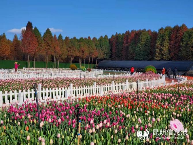 在第七屆郁金香花展開展之際,已有‘粉色印記’、‘肉色印記’、‘巨粉’、‘世界之火’、‘滑雪板’等7個品種郁金香開始陸續(xù)綻放,或紅、或粉、或白色的花朵映襯在綠葉之中,呈現(xiàn)出滿園春色的景觀,而這片花田猶如給大地鋪上了彩色花毯,置身其中,心都醉了。撈漁河濕地公園郁金香花田不遠(yuǎn)處的中山杉,有80%已呈現(xiàn)出紅色與金黃色,在昆明湛藍(lán)的天空和朵朵白云映襯下,更顯春色的多姿多彩。