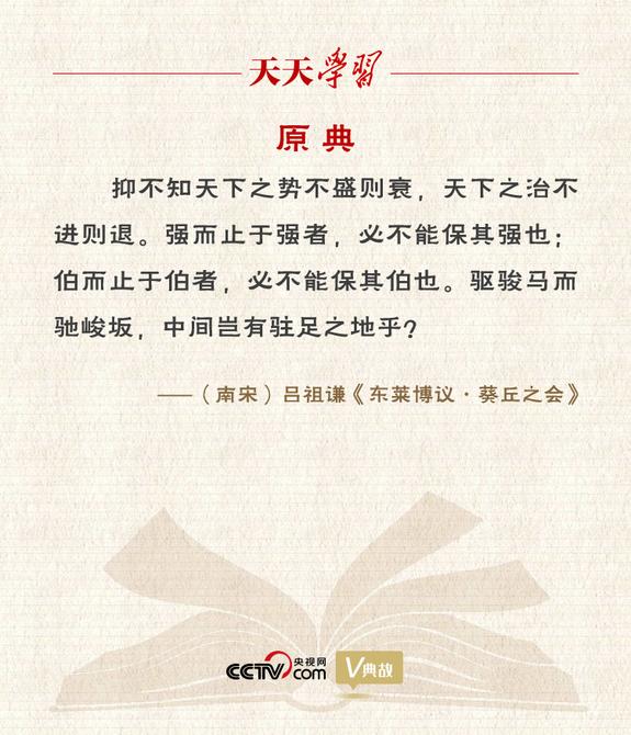 “天下之勢(shì)不盛則衰,天下之治不進(jìn)則退”出自《東萊博議》卷十一《葵丘之會(huì)》,是呂祖謙就齊桓公葵丘會(huì)盟發(fā)的一篇議論,意思是:天下大勢(shì)此消彼長(zhǎng),如果不能繼續(xù)強(qiáng)盛就會(huì)走向衰落;國(guó)家治理不進(jìn)則退,如果不能繼續(xù)前進(jìn)就會(huì)走向倒退。事實(shí)也正是如此。通過葵丘會(huì)盟,齊桓公成為春秋時(shí)期的首位霸主,登上霸業(yè)的頂峰??饡?huì)盟后,齊桓公志得意滿,特別是在管仲去世后,任用易牙、豎刁、開方等一批小人,日益走向昏庸,齊國(guó)國(guó)勢(shì)也逐漸衰落。對(duì)此,呂祖謙認(rèn)為,無論諸侯、公伯還是霸主,如果“強(qiáng)而止于強(qiáng)”“伯而止于伯”,那么強(qiáng)者“必不能保其強(qiáng)也”,伯者“必不能保其伯也”。
