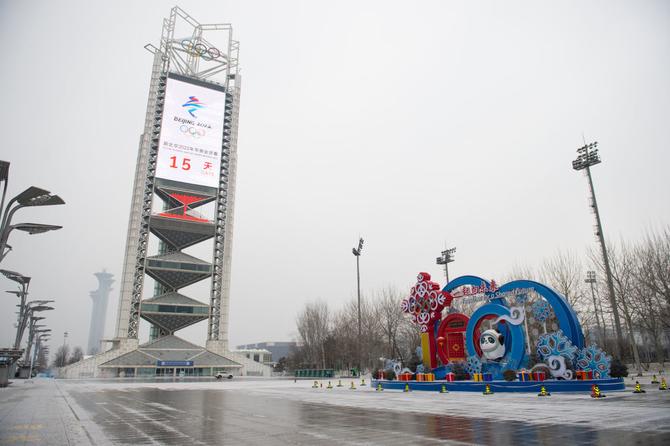 1月20日,位于北京奧林匹克公園內(nèi)的北京冬奧會(huì)倒計(jì)時(shí)牌和冬奧主題景觀。新華社記者陳鐘昊/攝