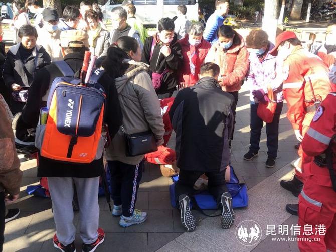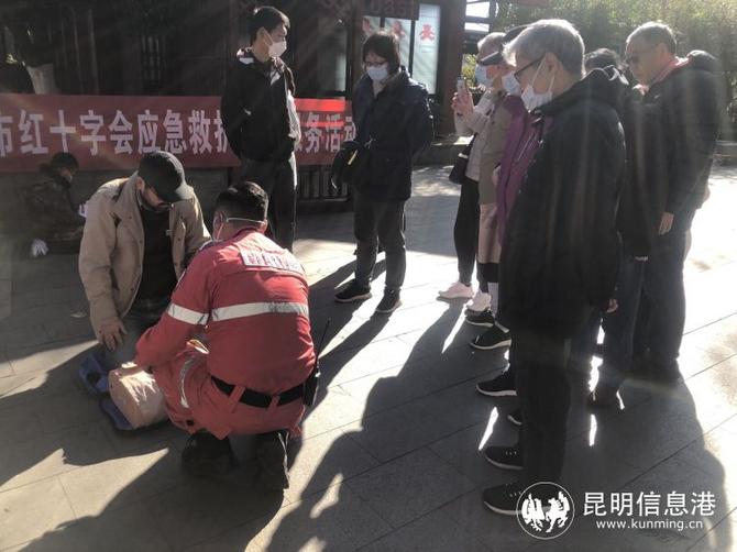 昆明信息港訊 記者李紅鸞 “雙手交叉,掌根重疊,五指翹起,手臂伸直,利用上半身的重量向下按壓,按壓30次,然后按壓的深度為5-6厘米,01、02、03、04……”1月22日上午,翠湖公園西門口站滿了圍觀的群眾,昆明紅十字救援隊志愿者們正在開展“紅十字應(yīng)急救護進景區(qū)”志愿服務(wù)活動。