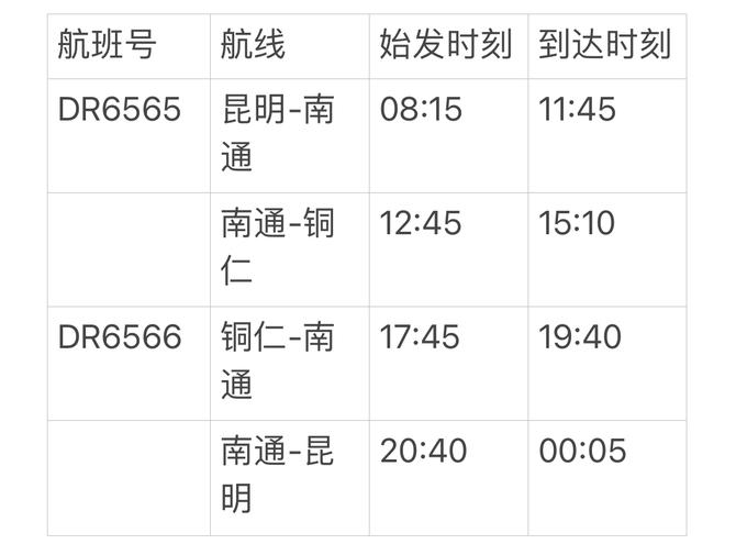 “昆明=南通=銅仁”航班班期計(jì)劃為每周二、四、六執(zhí)飛,航班信息如下: