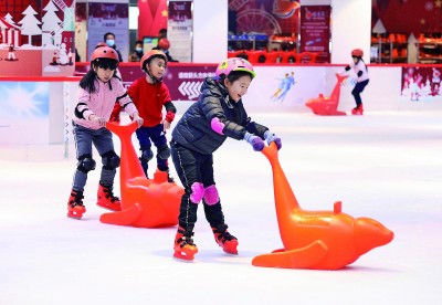 1月23日,小朋友們在河北省石家莊市裕華區(qū)歡樂匯商場的滑冰場玩耍。新華社發(fā)