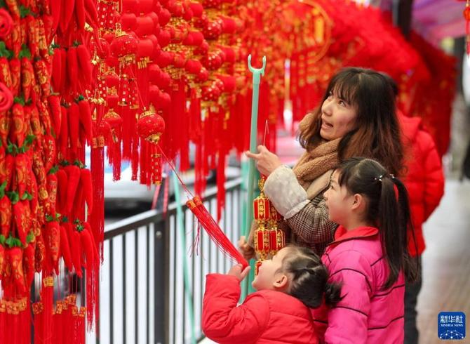1月23日,市民在貴州省銅仁市玉屏侗族自治縣年貨市場挑選春節(jié)飾品。新華社發(fā)(胡攀學 攝)