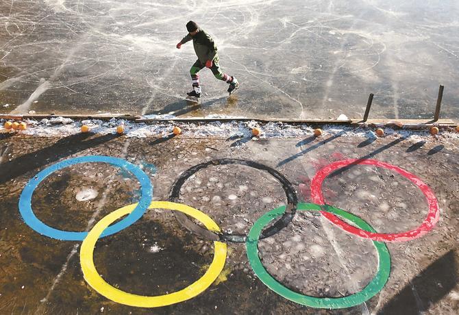 滑冰愛(ài)好者在沈陽(yáng)一公園冰面上的“五環(huán)”標(biāo)志旁滑冰健身。