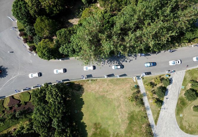 在安徽省合肥市,自動(dòng)駕駛車輛準(zhǔn)備駛?cè)?G示范線(2020年9月3日攝,無人機(jī)照片)。新華社記者 劉軍喜 攝