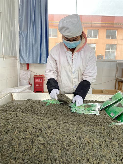 在雙柏縣游子山茶園的加工車間,工作人員正忙著給工作臺(tái)上散裝的茶葉分裝。