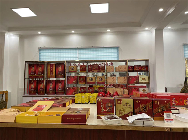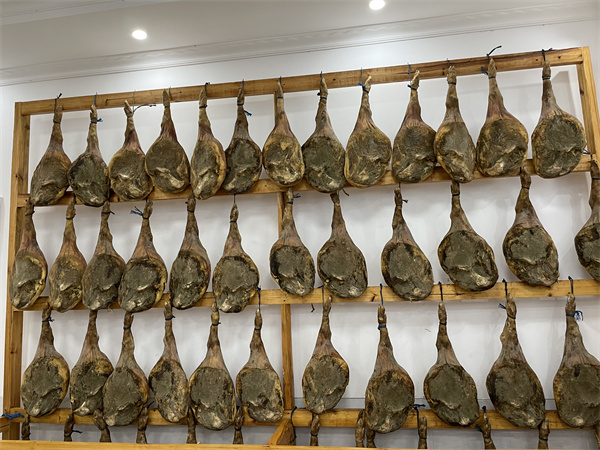 在牟定縣楚雄彝家香經(jīng)貿(mào)有限公司產(chǎn)品展廳內(nèi),各式各樣的彝家火腿琳瑯滿目。