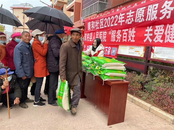 天空飄著蒙蒙細(xì)雨,雙柏縣妥甸鎮(zhèn)康和社區(qū)就業(yè)服務(wù)中心門前的帳篷下,年邁的老人端坐著由志愿者為其理發(fā);在慰問(wèn)品發(fā)放處,一群年長(zhǎng)的異地搬遷居民整齊排隊(duì)免費(fèi)領(lǐng)取愛(ài)心糧油產(chǎn)品。