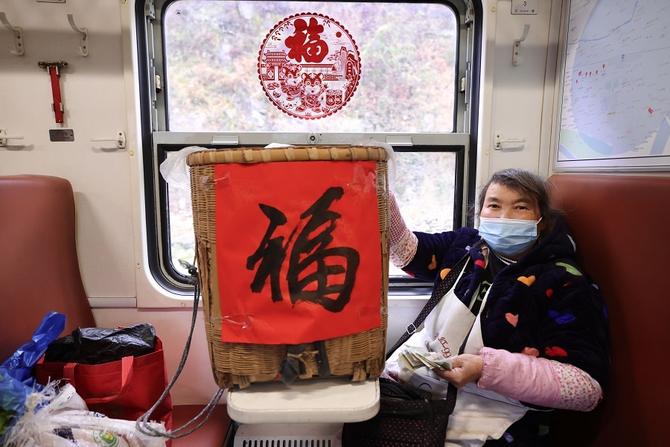 1月25日是農(nóng)歷小年,廣元開往寶雞的6064次慢火車?yán)?,彩色的氣球、各色的彩帶、紅紅的燈籠、虎年的窗花、寫著“致富路上,慢火車一直都在”的窗貼以及象征豐收的蔬菜、農(nóng)作物掛件裝點(diǎn)著車廂,整個車廂里洋溢著歡樂。