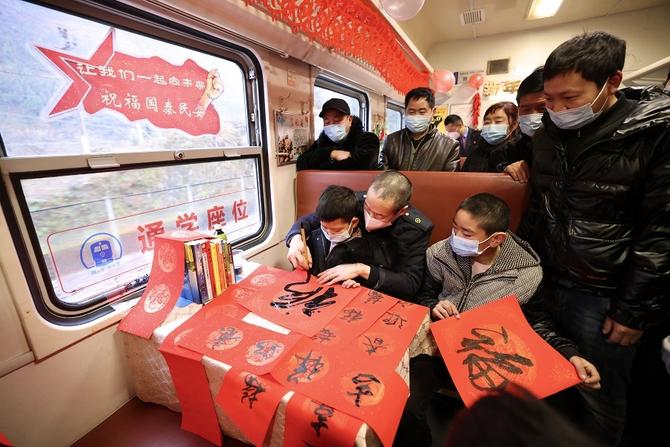在洋溢著幸福溫情的車廂里,列車工作人員和乘車旅客一道舉起印有“讓我們一起向未來,祝福國泰民安”“祝福偉大祖國繁榮昌盛”的心愿牌同慶新春。