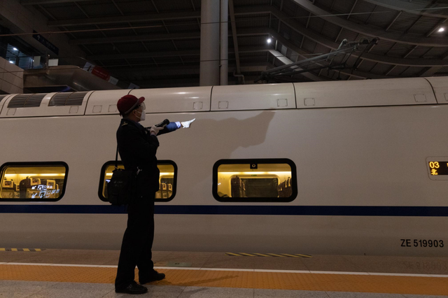 像孫瑋縱這樣的隨車機械師,在蘭州車輛段蘭州西動車運用所里還有142名。春運期間,由于乘客數(shù)量大量增加,他們的工作時間進(jìn)行了調(diào)整,從過去的上一天休息兩天變成連續(xù)上兩天休息兩天,48小時的密集工作,只為守護(hù)每位乘客的安全。(董逸鳴/供圖)