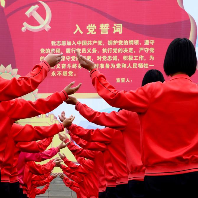 許多人對(duì)華坪女子高中的“紅色教育”印象深刻:女孩子們身著鮮紅的校服留著齊耳短發(fā),課間操大聲唱《萬(wàn)疆》跳改編版的“南泥灣”;每周一隆重?zé)崃业纳靸x式上重溫入黨誓詞,在“共產(chǎn)黨人頂天立地”的標(biāo)語(yǔ)下,進(jìn)行震撼人心的革命傳統(tǒng)教育;孩子們呼喊最多的口號(hào),除了“加油上清華,加油上北大”,就是“感黨恩、聽黨話,做黨的好女兒”……