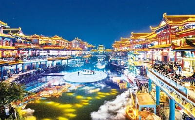春節(jié)前夕,四川省眉山市穿越城水街上演水上文藝演出。劉國(guó)興攝(人民圖片)
