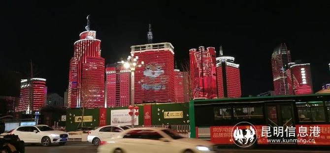 南屏街周邊、東風廣場、交三橋、北辰財富中心、白云路等地,如今,只要走上昆明街頭,隨處可見一棟棟樓宇上,“祝全市人民新年快樂!”“萬事如意!虎年大吉!”字樣的霓虹燈點亮夜色。高高的樓宇墻體上,不停播放由燈光組成的、以慶?;⒛晷麓簽橹黝}的巨型“燈光熒幕”彩色動圖。加上北京路、人民路、滇池路、盤龍江沿線樓宇及盤龍江燈光亮化景觀,春城昆明瞬間呈現出喜慶、流光溢彩、亮麗紛呈的夜景,洋溢著歡樂、祥和、喜慶、平安的節(jié)日氛圍。昆明街頭還隨處可見新春裝飾,有紅燈籠、中國結,加上路邊盛放的鮮花,無一不在彰顯著春節(jié)的喜慶與歡樂。