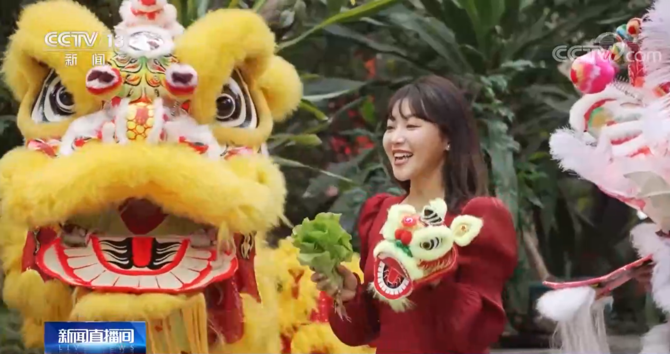 醒獅“采青”,采的就是這棵生菜,生菜諧音“生財”。獅子采了青,再分給街坊,表示把財氣、福氣分給了大家。在這里,我們也一起祝福觀眾朋友們身體健康、大展鴻圖。