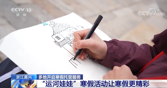 在嘉興市南湖區(qū)解放街道航明社區(qū),孩子們?cè)谏鐓^(qū)工作人員的組織下,來到市區(qū)蘆席匯歷史文化街區(qū)寫生畫畫。三年級(jí)的殳希正在畫剛剛看到的端平橋,這是坐落在古運(yùn)河上600多年的歷史古橋。