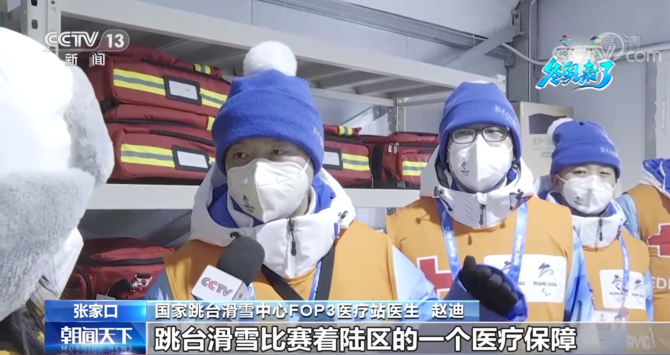 國(guó)家跳臺(tái)滑雪中心FOP3醫(yī)療站醫(yī)生 趙迪:我們的職責(zé)是負(fù)責(zé)跳臺(tái)滑雪比賽著陸區(qū)的一個(gè)醫(yī)療保障,在賽時(shí)是在場(chǎng)邊同步觀看比賽,一旦有傷情,就可以第一時(shí)間入場(chǎng)施救。