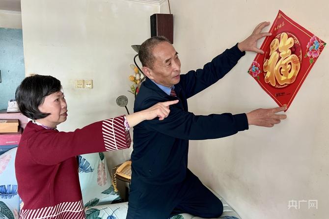 春節(jié)臨近,中國鐵路南昌局集團有限公司漳州車務段泉州東站貨運主任計偉(右)與家人貼福字、賀新春(央廣網(wǎng)發(fā) 尤德意攝)