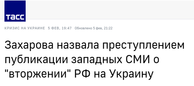 塔斯社:扎哈羅娃稱西方媒體關(guān)于俄羅斯“入侵”烏克蘭的報道是犯罪行為