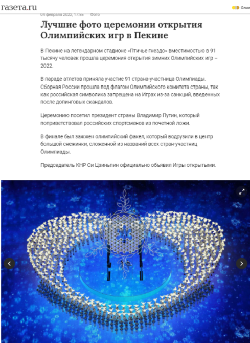 4日當(dāng)天,俄羅斯第一頻道(1tv.ru)對(duì)開幕式進(jìn)行了全程直播,俄新社、《俄羅斯報(bào)》等媒體則在網(wǎng)站版面頭條位置進(jìn)行了圖文直播報(bào)道。俄塔社、《俄羅斯報(bào)》、連塔網(wǎng)等多家媒體對(duì)開幕式全程進(jìn)行了回顧報(bào)道,并冠以“北京冬奧會(huì)開幕式的精彩瞬間”等標(biāo)題。