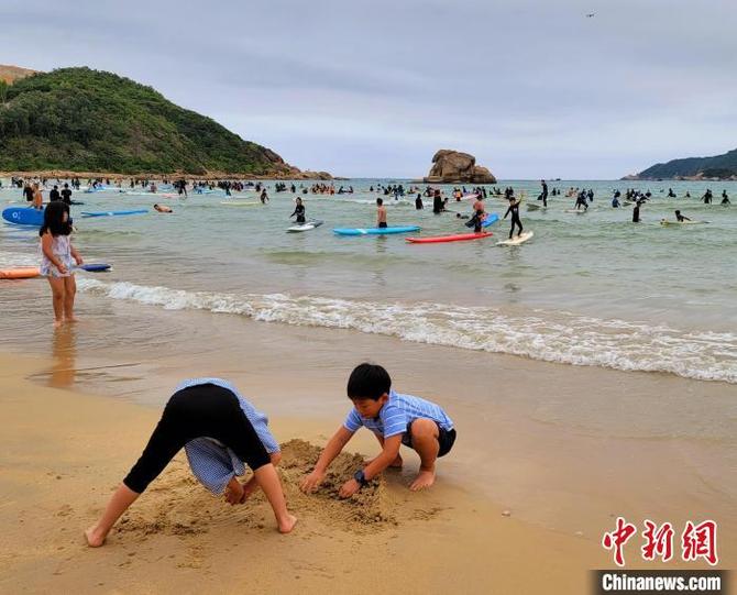 2月3日三亞后海,孩童們在挖沙、沖浪。 王曉斌 攝