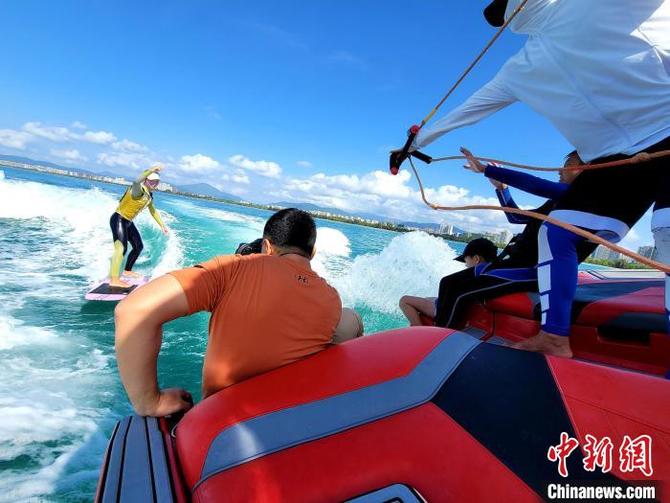 尾波沖浪是三亞近年來冒出的熱門玩法。在三亞灣,船舷兩側(cè)夾帶沖浪板的造浪艇,就像躍出水面的飛魚,在廣闊海面來回穿梭。7歲小朋友董任博宇踩著沖浪板,已經(jīng)學(xué)會不需要繩索牽引,單憑造浪艇造出的浪就能輕松滑行。他13歲的姐姐任薏帆則可以躍過一個浪后,接著挑戰(zhàn)下一個浪頭。