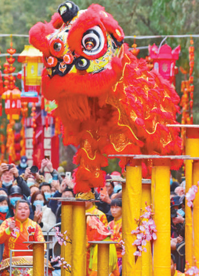 2月2日,人們在江蘇省無錫市惠山古鎮(zhèn)景區(qū)觀看梅花樁舞獅民俗表演。還月亮攝(新華社發(fā))