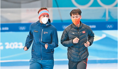 1月29日,國家速滑館,中國速度滑冰隊隊員寧忠?guī)r(右)與挪威選手一同熱身。新華社記者 武 巍攝