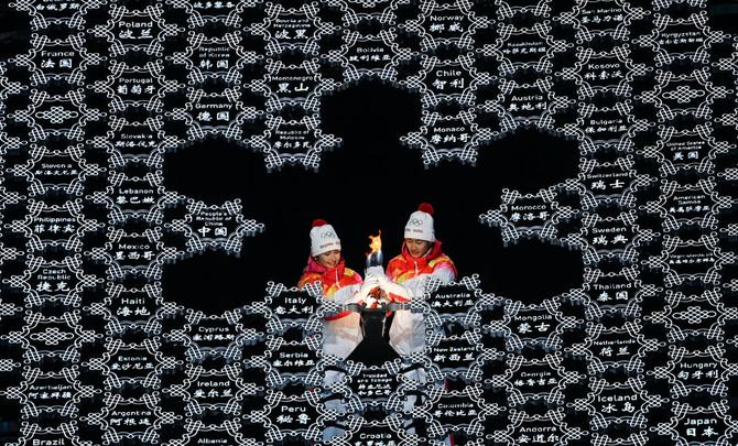 2月4日晚,第二十四屆冬季奧林匹克運(yùn)動會開幕式在北京國家體育場舉行。這是最后一棒火炬手迪妮格爾·衣拉木江(左)和趙嘉文將火炬嵌入“大雪花”中央。新華社記者李尕?cái)z