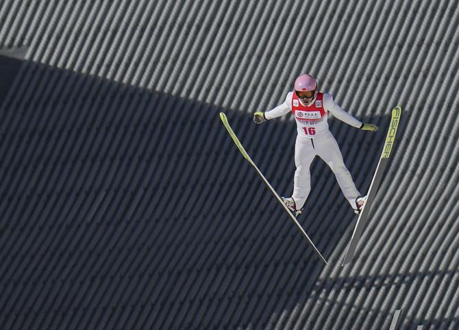 2021年12月5日,“相約北京”系列測試賽2021-2022國際雪聯(lián)北歐兩項(xiàng)洲際杯個(gè)人大跳臺+10公里越野滑雪比賽在張家口賽區(qū)國家跳臺滑雪中心、國家越野滑雪中心舉行。中國選手趙嘉文在大跳臺比賽中。新華社記者胡虎虎攝