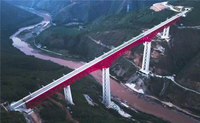 中老鐵路首發(fā)列車(chē)駛過(guò)中國(guó)云南省元江哈尼族彝族傣族自治縣境內(nèi)的元江雙線特大橋(2021年12月3日攝,無(wú)人機(jī)照片)。新華社記者 王冠森 攝