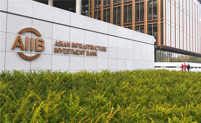 這是2021年10月25日拍攝的亞洲基礎(chǔ)設(shè)施投資銀行(亞投行)標(biāo)志。新華社記者 李賀 攝
