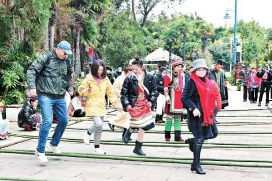 游人在云南民族村跳起竹竿舞,體驗(yàn)哈尼風(fēng)情