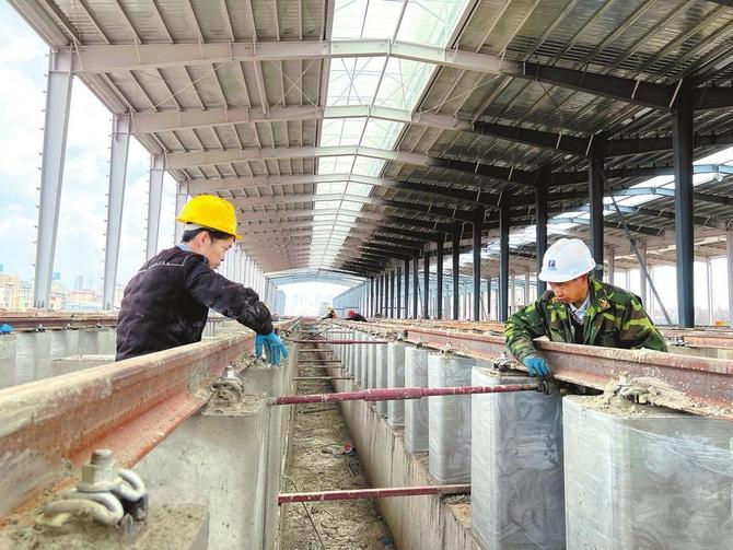 2月5日上午,記者在中鐵十二局集團(tuán)電氣化工程昆明地鐵5號(hào)線(xiàn)B2標(biāo)項(xiàng)目漁村停車(chē)場(chǎng)看到,現(xiàn)場(chǎng)機(jī)械轟鳴,工人穿梭忙碌。停車(chē)場(chǎng)入場(chǎng)鐵軌處,不少工人手拿電纜和線(xiàn)路圖紙,正在進(jìn)行信號(hào)系統(tǒng)的安裝和調(diào)試。