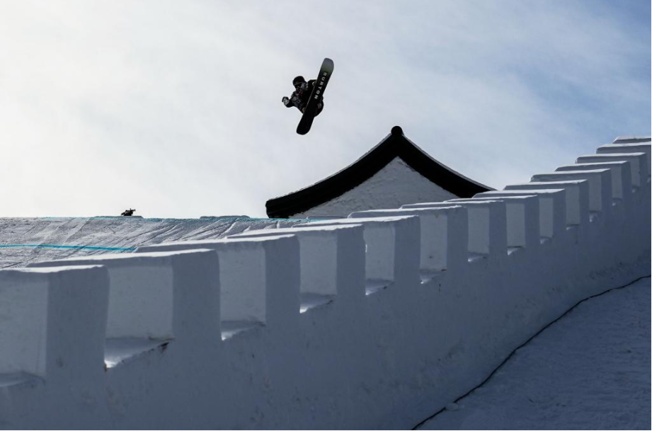 在單板滑雪坡面障礙技巧首度被引入的2014年索契冬奧會上,選手們飛躍的是俄羅斯套娃。此番在北京,當單板好手們到達云頂時,他們驚喜地發(fā)現(xiàn),等待他們的是冰雪打造而成的壯觀城墻與烽火臺。