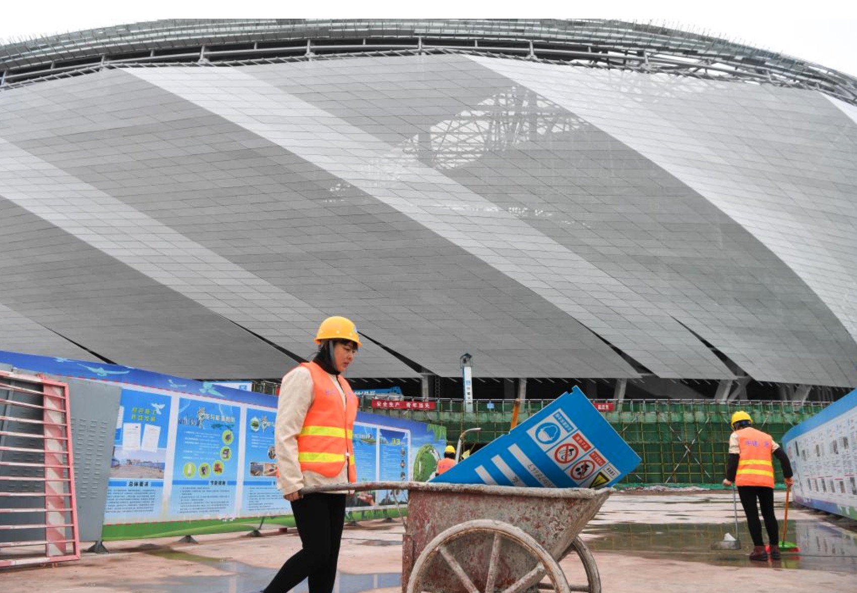 2月7日,重慶龍興足球場項目建設現(xiàn)場,工作人員正在進行清掃工作,為全面復工做準備。新華社記者王全超 攝