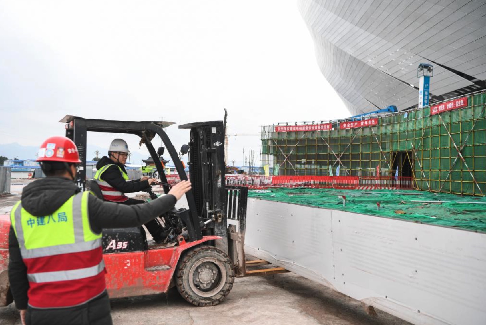 2月7日,重慶龍興足球場項目建設現(xiàn)場,工作人員正在對設備進行安全檢查,為全面復工做準備。新華社記者王全超 攝