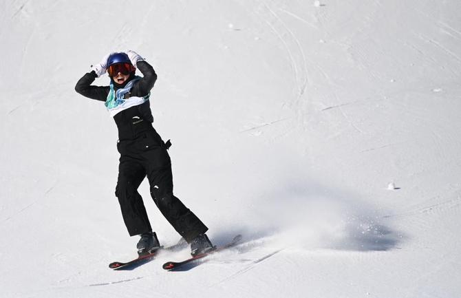 馭雪而馳、躍向藍(lán)天、翻轉(zhuǎn)兩周、轉(zhuǎn)體1620……3秒鐘后,穩(wěn)穩(wěn)落地,雪板激起的雪沫劃破全場(chǎng)緊張的寂靜,中國(guó)選手谷愛凌大聲尖叫,雙手抱頭,掩面而泣。2003年出生的她,用從未做出的超高難度動(dòng)作成功挑戰(zhàn)第三跳,上演超級(jí)大逆轉(zhuǎn),在8日舉行的北京冬奧會(huì)自由式滑雪女子大跳臺(tái)決賽中摘得桂冠。