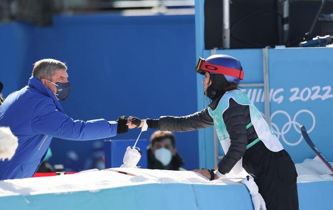 2月8日,國(guó)際奧委會(huì)主席巴赫(左)向中國(guó)選手谷愛凌表示祝賀。新華社記者丁旭攝