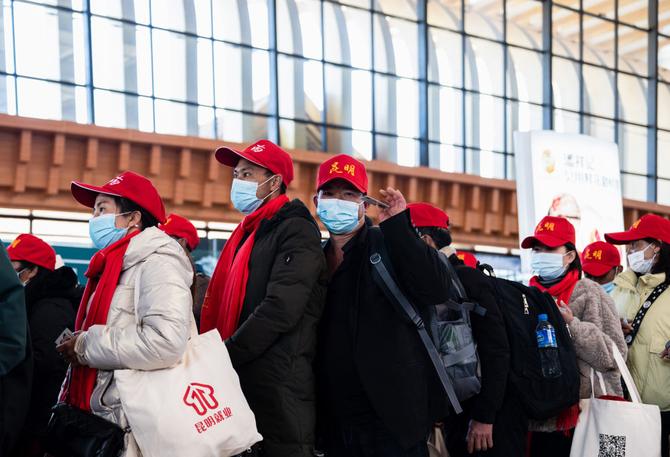 2月8日,昆明南站人潮涌動(dòng)。昆明市尋甸縣雞街鎮(zhèn)澤和村村民張?jiān)坪推拮訌埥B芬頭戴小紅帽,背著行囊,在人社部門(mén)、鐵路部門(mén)工作人員有序組織引導(dǎo)下,和老鄉(xiāng)們統(tǒng)一乘坐高鐵外出務(wù)工。
