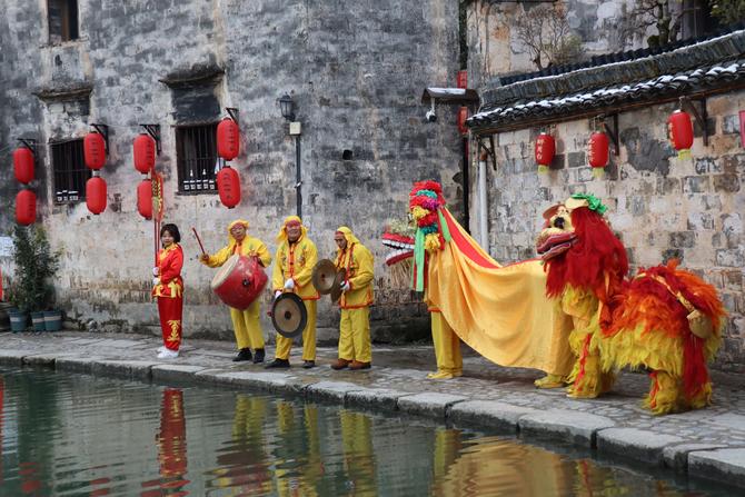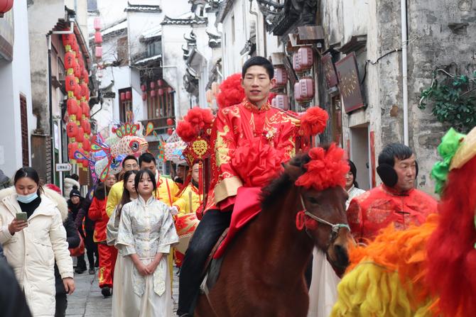拋繡球、選佳婿,騎大馬、抬花轎,繞古樹、踩福袋,舞花燈、敲鑼鼓。近日,一場古色古香、獨具傳統(tǒng)徽州民俗文化特色的婚禮在黟縣雪后的宏村上演。新郎騎著高頭大馬,新娘坐上大紅花轎,浩浩蕩蕩的迎親儀仗隊伍舉著喜慶的花燈,伴隨著鑼鼓聲,走遍宏村的各個地點,街頭巷道熱鬧非凡。