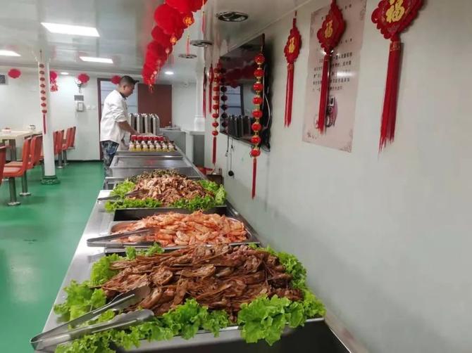 臨近中午,鹽城艦餐廳里的官兵們排起長隊,有說有笑,期待遲來的節(jié)日大餐。分餐后,炊事員身著整潔的炊事服,遞碗、分菜、介紹菜品,為官兵提供細致周到的服務。