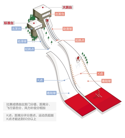 跳臺滑雪的比賽場地主要由起滑門、出發(fā)臺、助滑坡、起跳點、標準點(K點)、著陸坡和裁判臺構(gòu)成。跳臺有標準臺和大跳臺兩種,標準臺K點為95米,大跳臺K點是125米。K點是運動員距離分的評分原點。運動員落地,超過著陸區(qū)K點加分,不到K點則減分。運動員每次跳躍的分數(shù)由出發(fā)門分值、距離分、飛行姿態(tài)分、風(fēng)力補償分組成。助滑、起跳、著陸是比賽的關(guān)鍵部分。