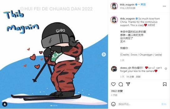 西班牙滑雪運(yùn)動(dòng)員蒂博·馬格寧用雙語(yǔ)感謝中國(guó)。(圖片來(lái)源:Instagram)