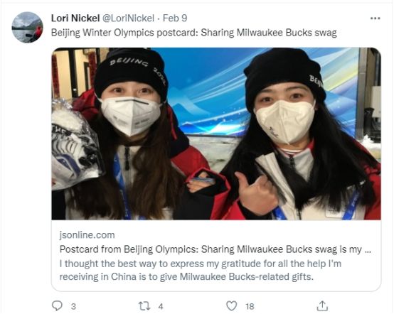 美國(guó)記者洛麗·尼克爾在海外社交媒體發(fā)文展示與志愿者們互換禮物。(圖片來(lái)源:推特)