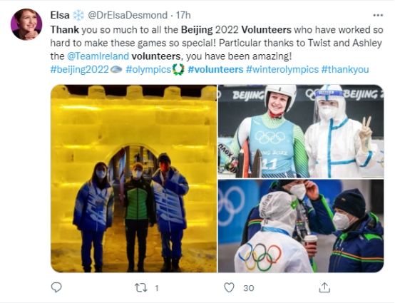 愛(ài)爾蘭雪橇運(yùn)動(dòng)員埃爾莎·德斯蒙德在自己的社交賬號(hào)發(fā)文感謝志愿者們的熱情幫助。(圖片來(lái)源:推特)