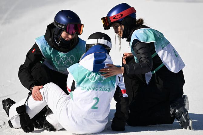 2月8日,中國選手谷愛凌(右)和瑞士選手瑪?shù)贍柕隆じ窭啄拢ㄗ螅┰谧杂墒交┡哟筇_決賽后安慰法國選手泰絲·勒德。新華社記者 薛宇舸 攝