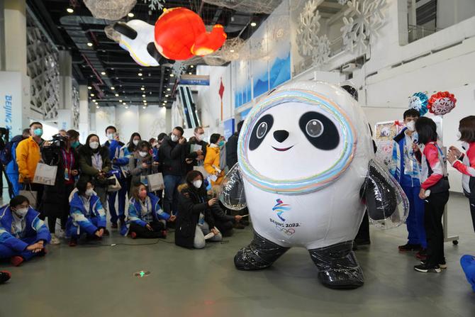 2月12日,“冰墩墩”在北京冬奧會主媒體中心舉辦的集體采訪活動中與現(xiàn)場觀眾互動。新華社記者鞠煥宗攝