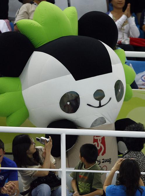 2008年8月14日,福娃“晶晶”來到國家游泳中心觀眾席為北京奧運會游泳比賽的選手加油助威。新華社記者丁旭攝